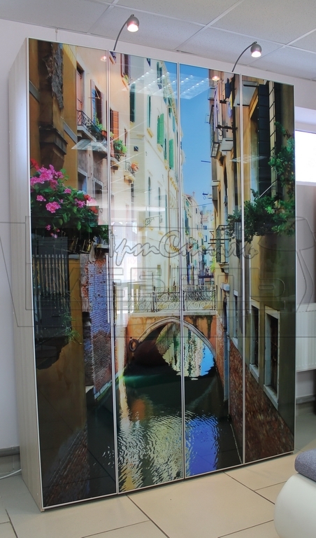 Фасад выполнен из алюминиевой рамки с фотопечатью на стекле. В качестве фасада можно использовать как лДСП, так и пластик, акрил, зеркало (любые плитные материалы)
